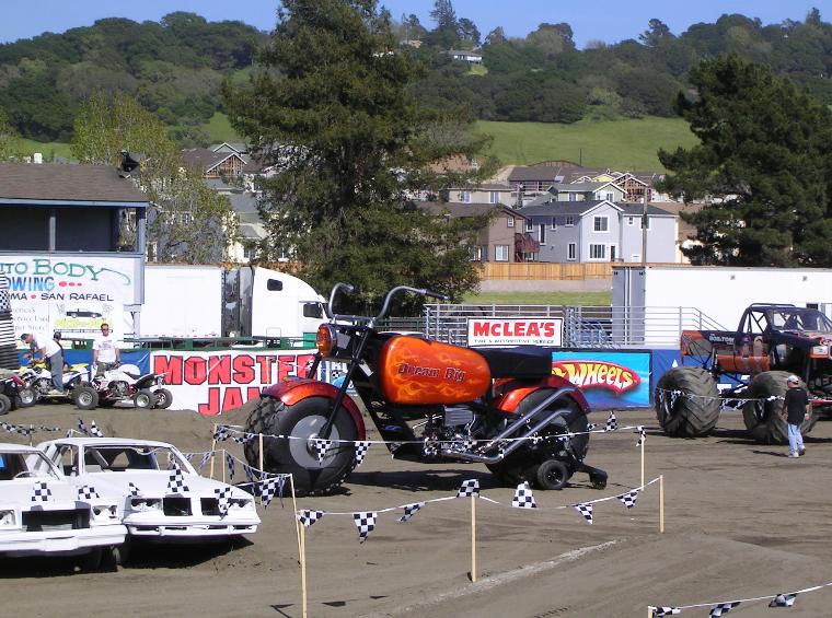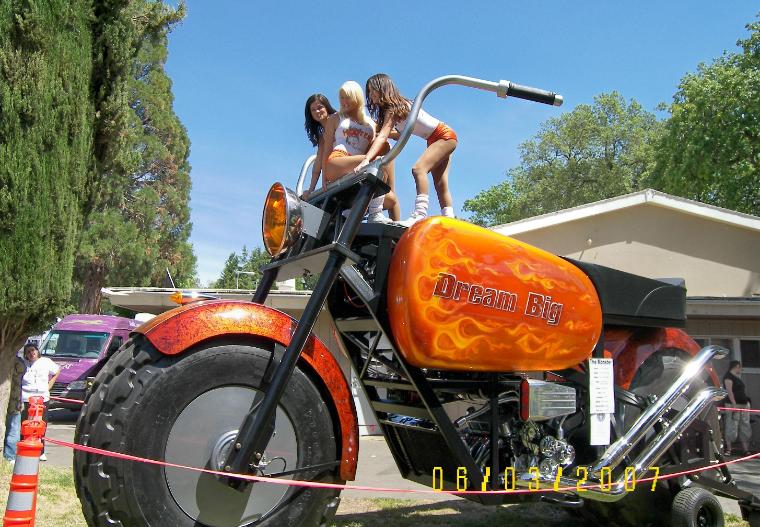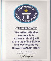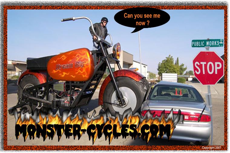 Monster Bike Specifications: Height ; 11ft. 3in. Tall Length ; 20ft. 4in. Long Width ; 74in. Tires ; 78in. Tall x 36in. Wide Engine ;(8.2L) 502ci./500hp, 600ft.lbs.Torque Transmission ; 2 forward gears plus reverse Weight; 6500 lbs.+ Seating ; 6 including driver Time to build ; 3.5 years plus additions! Top speed ; Been 50 mph but 65 mph do-able! Why it was built? 1. I thought I could! 2. Everyone said I could not! 3.Because it had not been done! 4. It was my dream! 5. Impossible tasks can be accomplished by hard work! 6. To inspire ALL to follow your dreams! 7. ALL things are possible to those who believe! |
